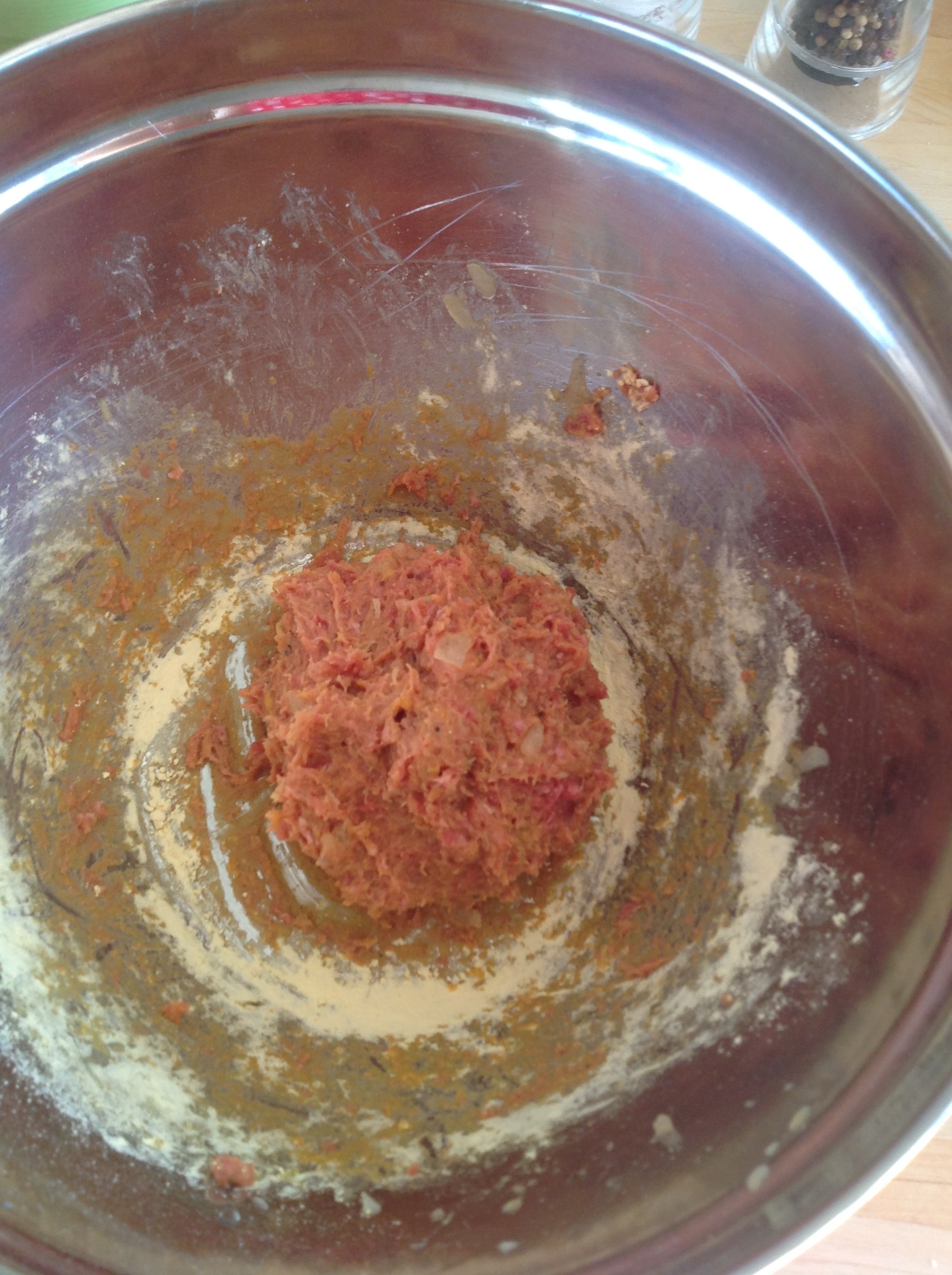 3.Add the onion, egg, flour, and seasoning and mix well. The mixture will be quite sticky, and it will not resemble an elastic dough. This is totally fine.