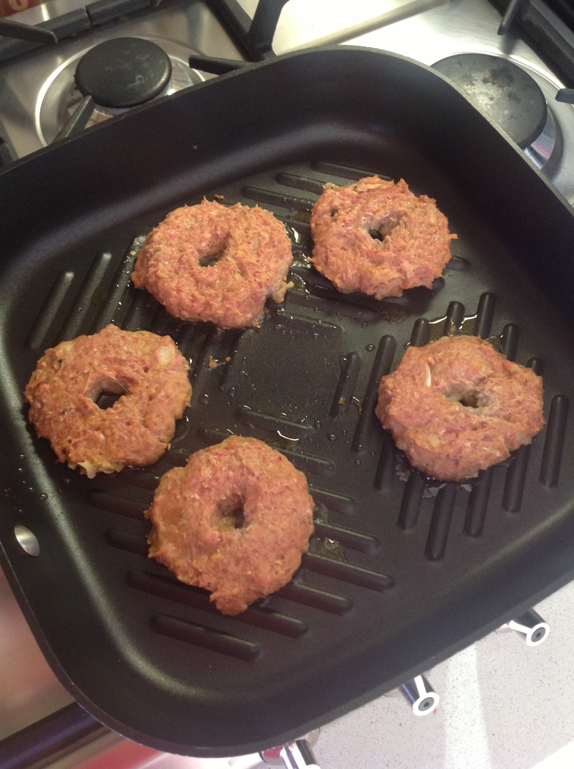 – Take 3 tablespoons of mixture and form a flat circular patty with a hole in middle.