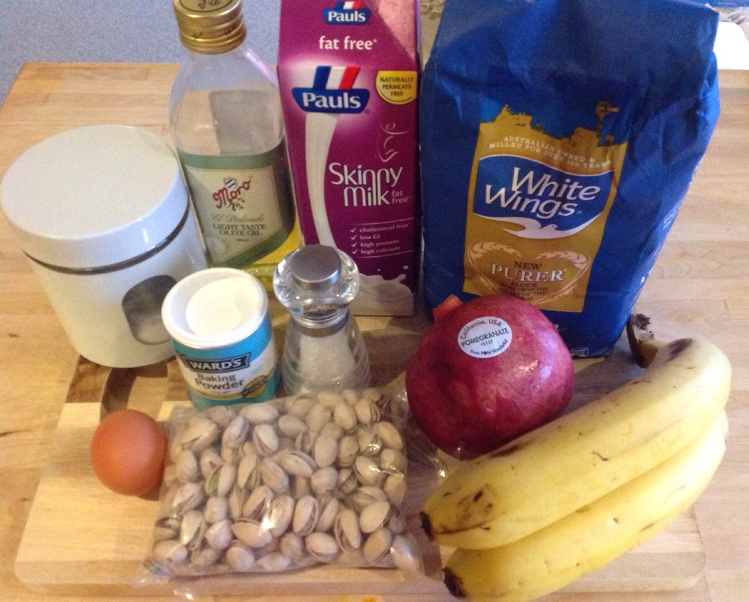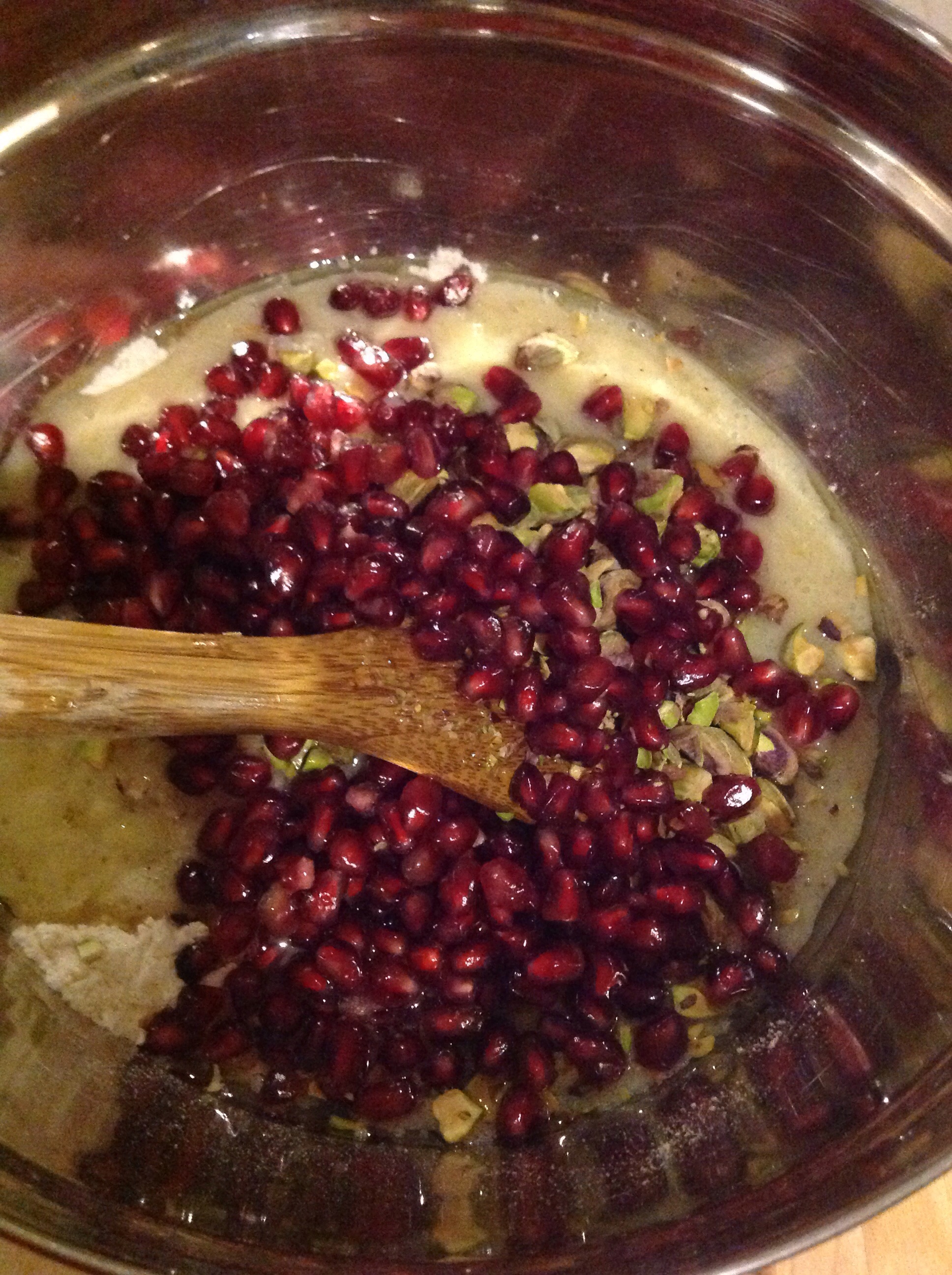 Ingredients:(Recipe from pomwonderful.com ) 20131224-232817.jpg 1 POM pomegranate 1/2 cup pistachio kernels 1.5 bananas (enough to make 1 cup mashed) 2 cups plain flour 3/4 cup sugar 2.5 teaspoons baking powder 1/2 teaspoon salt 1/3 cup extra light olive oil (or vegetables oil) 1/3 cup milk 1 egg, lightly beaten Directions: 1. Add all the dry ingredients except the pistachios to a bowl and mix well. 20131224-232550.jpg