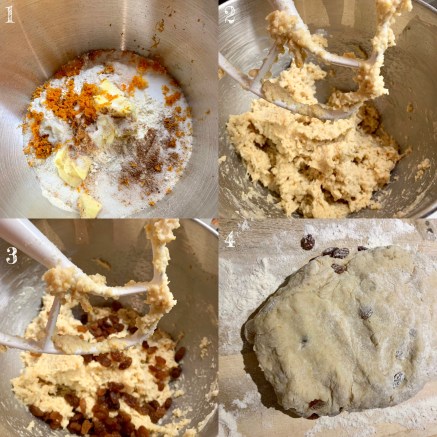 1- Put flour, yeast, salt, butter, sugar, mastic powder, mahlab, cinnamon, and orange zest into a large bowl.