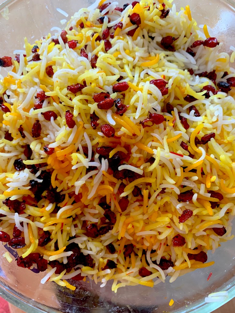 15. Add the saffron infused rice to the top of the white rice, followed by the fried barberries. You can also mix everything through if you like.